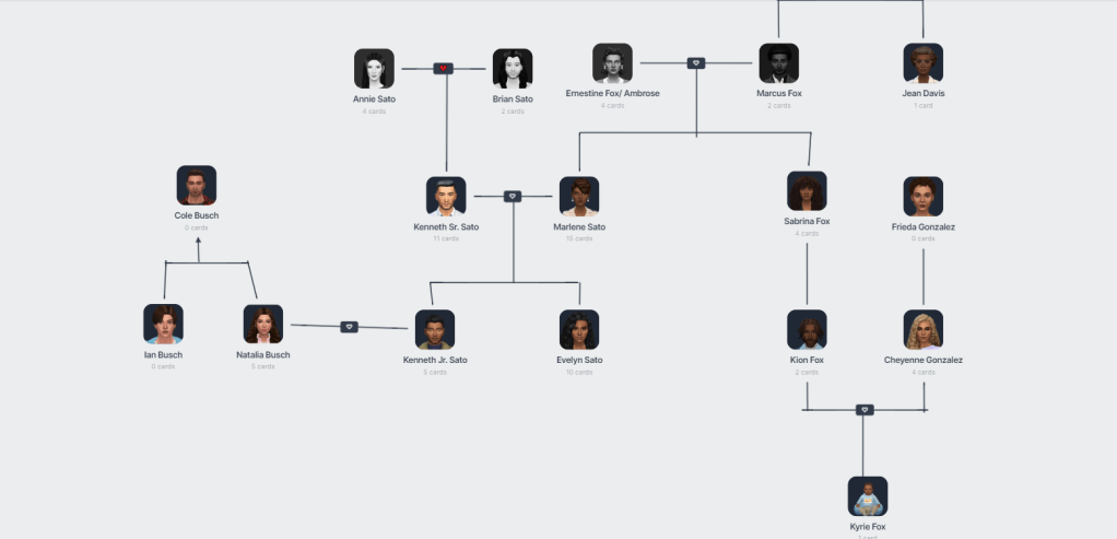 I have updated the Family Ties page. There you can see the major families that are going to be featured throughout this story. Below is the Sato/Fox/Busch family tree. Hopefully this family tree with help visual the relationship between the sims. You can also view a version at Sims Legacy Hub. So to celebrate the new year, let’s get some new shit on this blog! Part 3 of Chapter 1 is scheduled to post this week and I’m working hard on Part 4 so it’ll be out before the end of January.